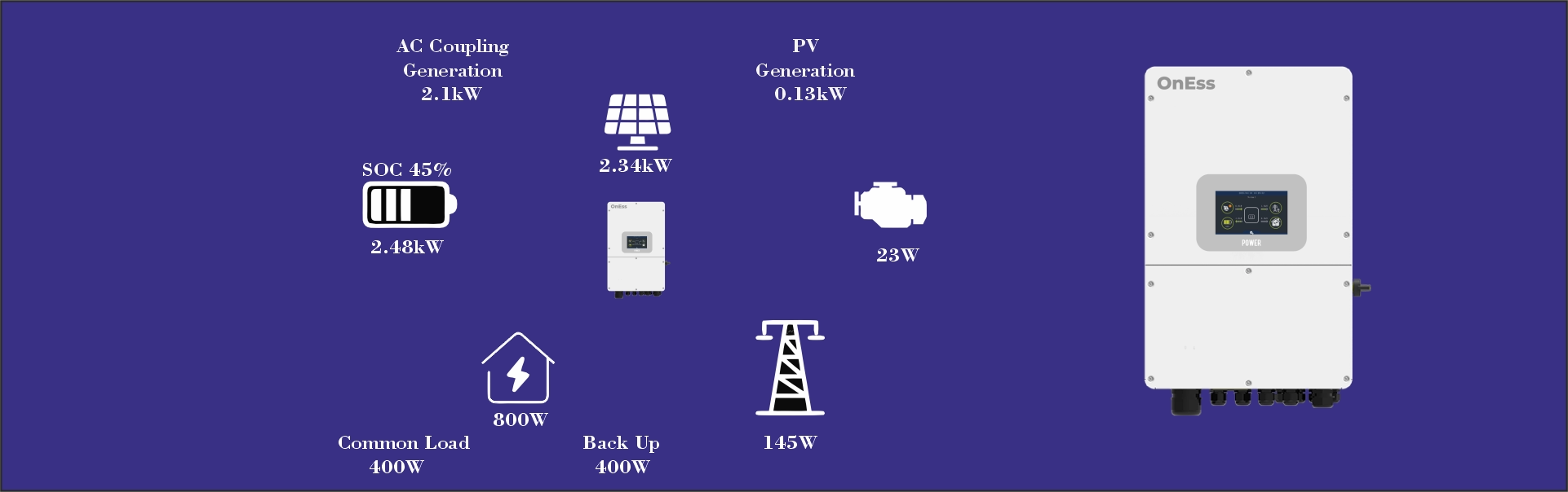 Modo Generador. Su uso suele ser frecuente cuando el inversor Híbrido OnEss trabaja en modo aislado de la red eléctrica (Off Grid). En este modo de trabajo el inversor permite conectar un generador eléctrico, como respaldo de energía ante una reducción de la producción fotovoltaica.